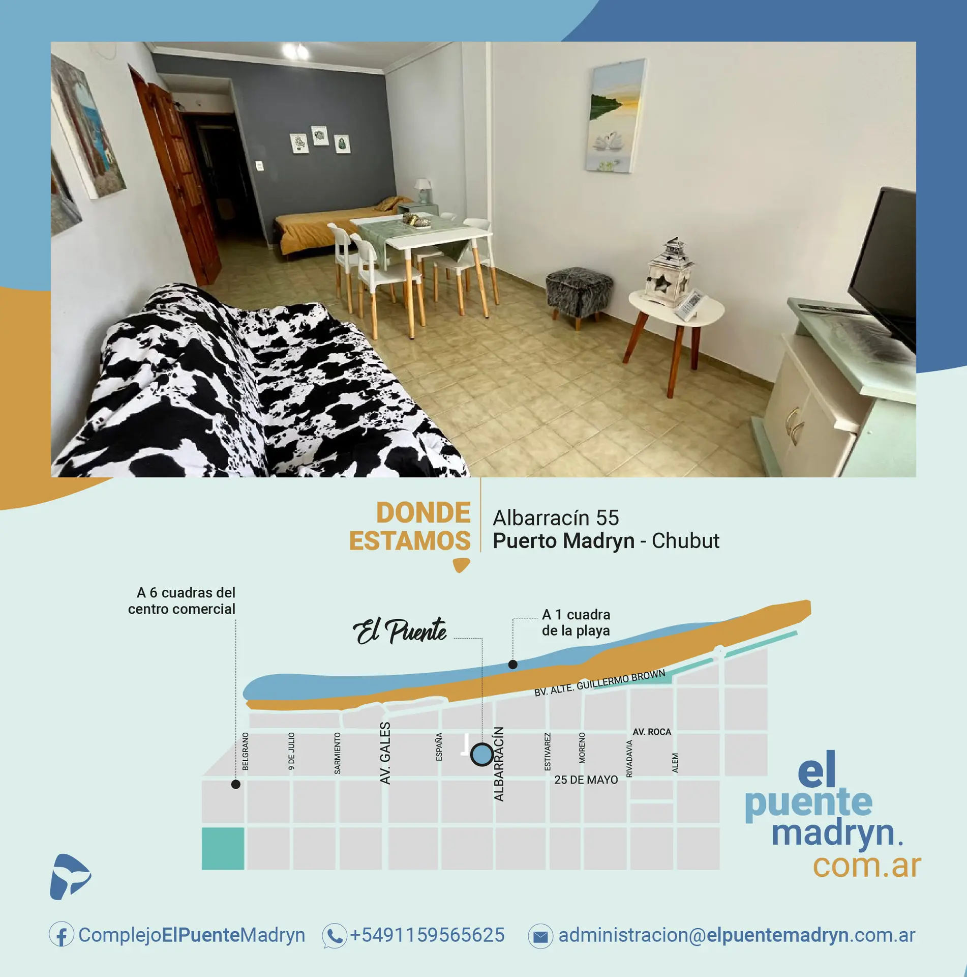 Complejo El Puente es la opción ideal para tu estadía en Puerto Madryn. Somos un complejo de amplios y confortables departamentos, completamente equipados, de 1, 2 y 3 ambientes. Gozamos de una ubicación privilegiada (a solo una cuadra del mar y a cinco del centro comercial).